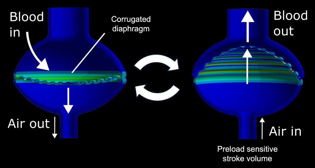 The key idea was to embed adaptation directly into the device. We designed a soft, elastomeric pump that passively adjusts its output based on filling conditions. By coupling preload (filling pressure) to stroke volume through the device geometry, the pump self-regulates output — increasing flow when more blood returns and decreasing it when less is available.